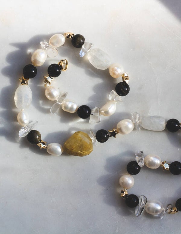 Deep Gold Obsidian forms the grounding foundation of the necklace, known for its protective and stabilizing qualities. Faceted Rutilated Quartz as a center piece adds subtle golden reflections, symbolizing clarity, confidence, and forward movement. Soft flashes of Moonstone introduce an intuitive, luminous energy, while Freshwater Pearl beads bring timeless elegance and calm. Delicate gold-plated hematite star beads appear like small celestial accents, adding structure and grounding to the design.